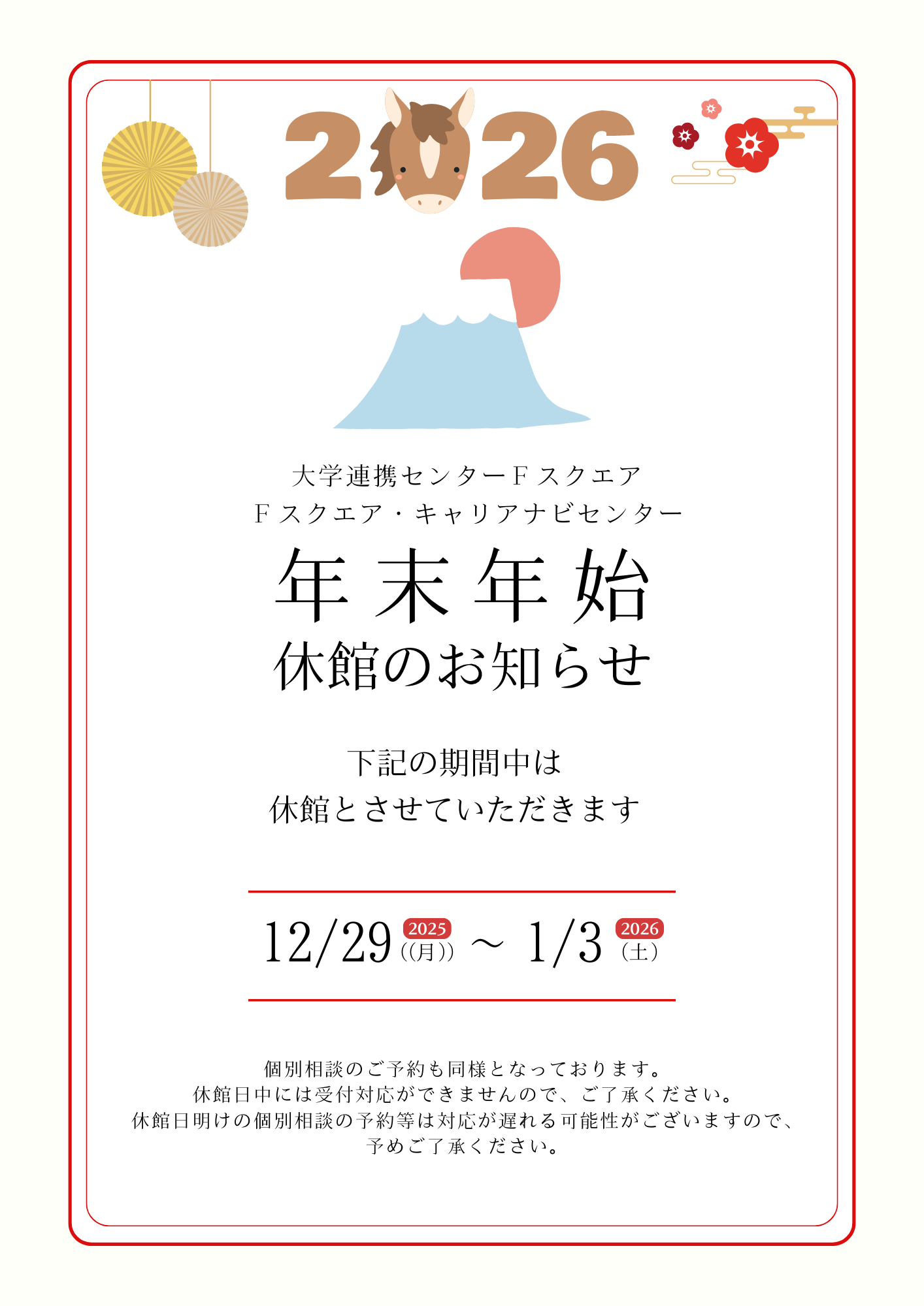 年末年始は以下スケジュールでFスクエアを休館とさせていただきます。